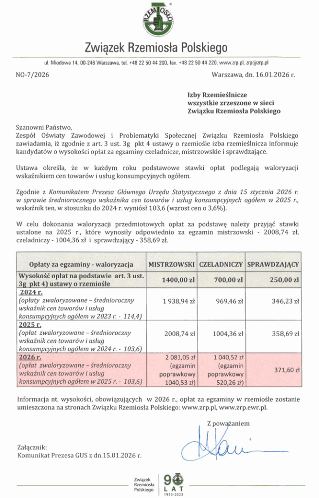 Informacja o wysokości opłat za egzaminy czeladnicze, mistrzowskie i sprawdzające w 2026 r.